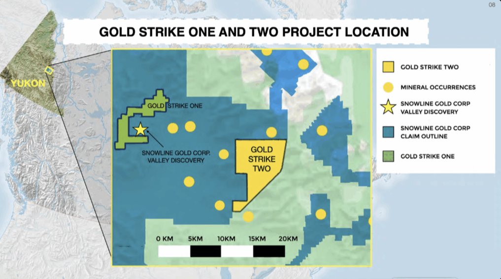 Snowline’s Valley discovery (yellow star) literally wrapped by Gold Strike One (green) and Gold Strike Two (yellow). The adjacency is striking.