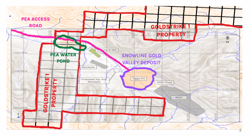 Snowline has drilled to within approximately thirty meters of Gold Strike’s boundary. Their PEA mine plan places a major water pond directly on Gold Strike’s land, not because they wanted to, but because they had no choice. To the east of the Valley deposit lies an impassable mountain range. There is no way to push an access road through it, no way to place critical surface infrastructure on that side. The only workable corridor is the one that runs straight onto Gold Strike’s property.